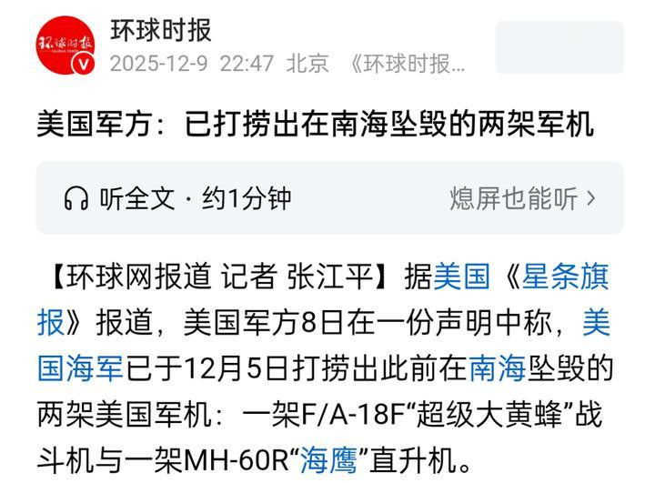 打捞工作直至12月5日才完成,距事故发生已40天。尽管坠机海域水深仅122米,且由专业打捞船“萨尔沃”号作业,但美军从事故发起到打捞船就位耗时长达17天,暴露了两大问题:
